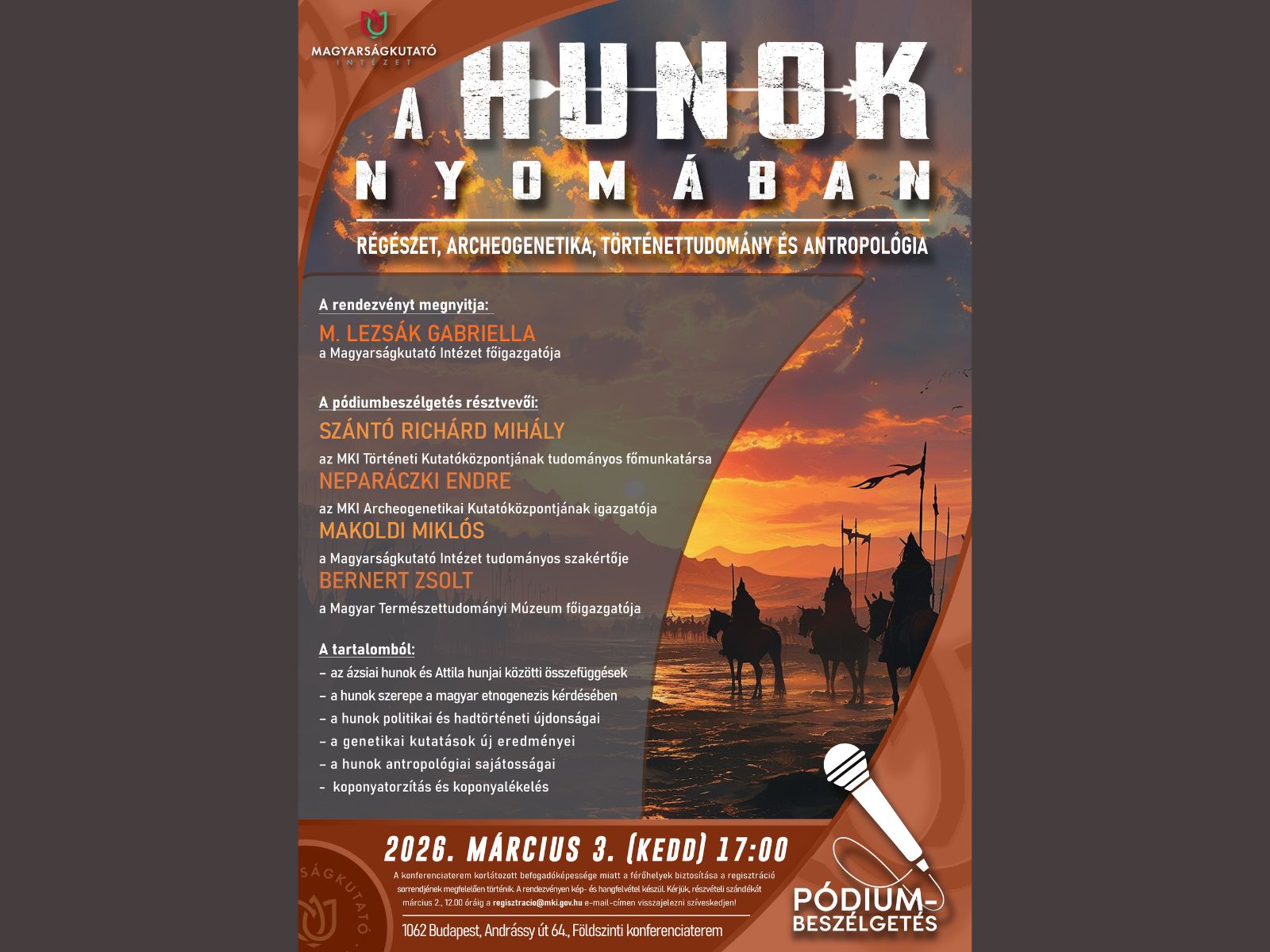 2026. március 3-án 17 órától, „Hunok nyomában” című sorozat keretében ismét a hunok története kerül a középpontba. Az interdiszciplináris pódiumbeszélgetésen a régészet, az archeogenetika, a történettudomány és az antropológia legfrissebb eredményei találkoznak.