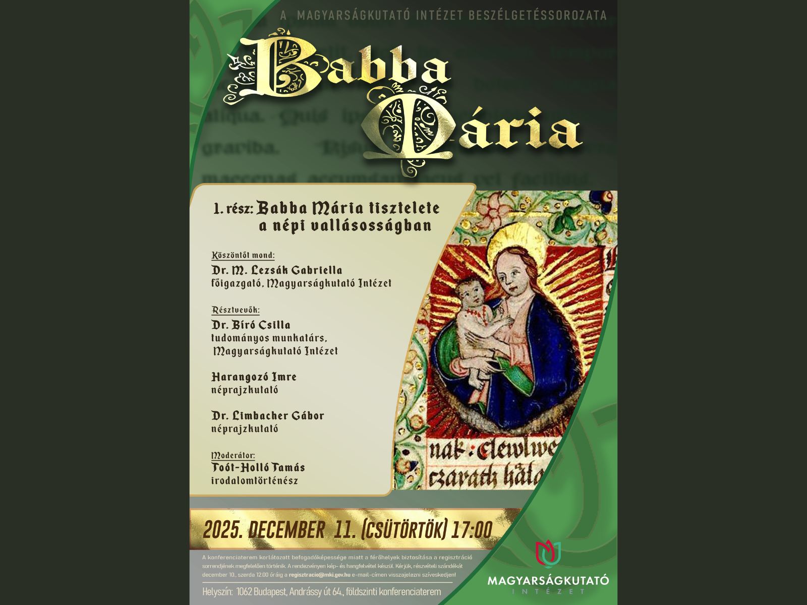A Magyarságkutató Intézet új, több részből álló beszélgetéssorozatot indít Babba Mária alakjáról, a magyar népi vallásosság egyik kiemelkedő szakrális hagyományáról. Az első alkalom 2025. december 11-én kerül megrendezésre.